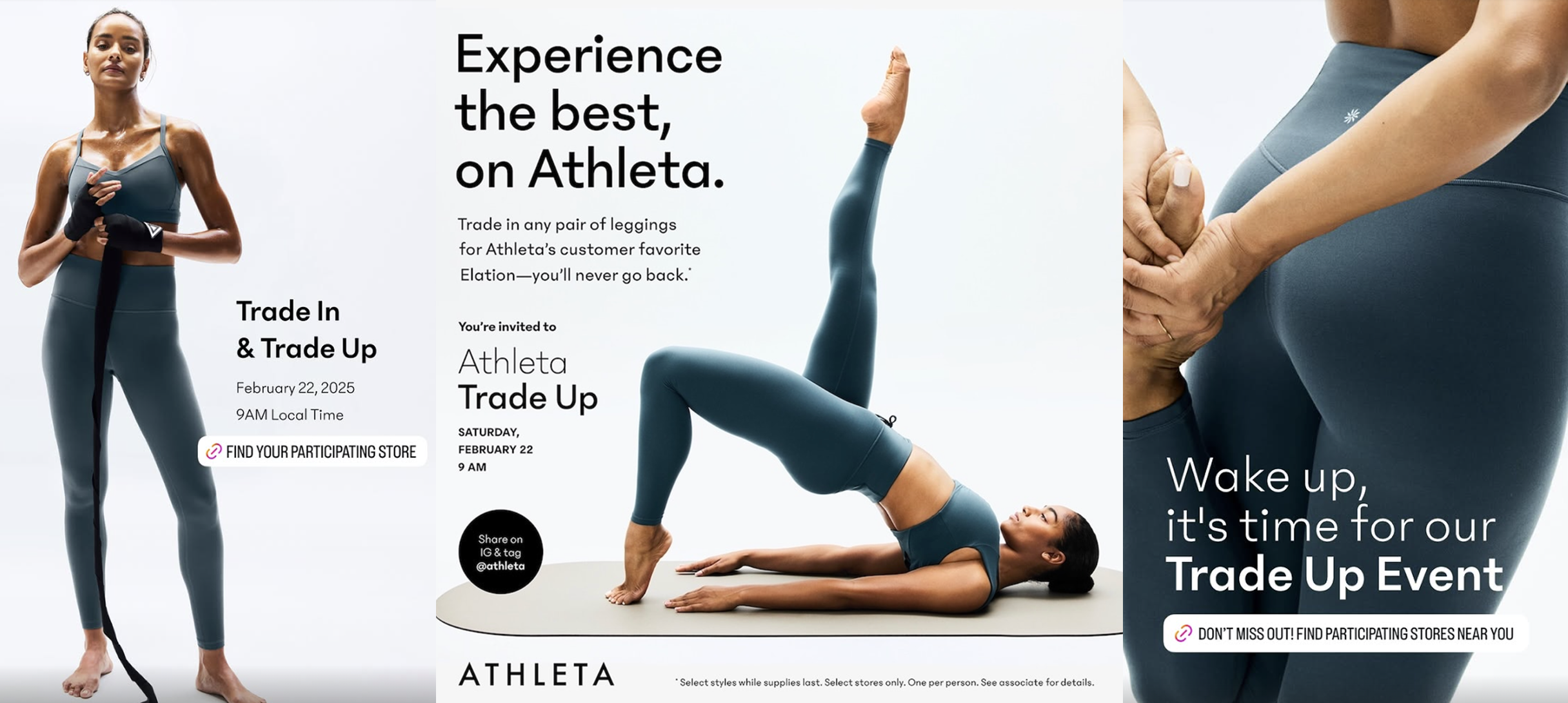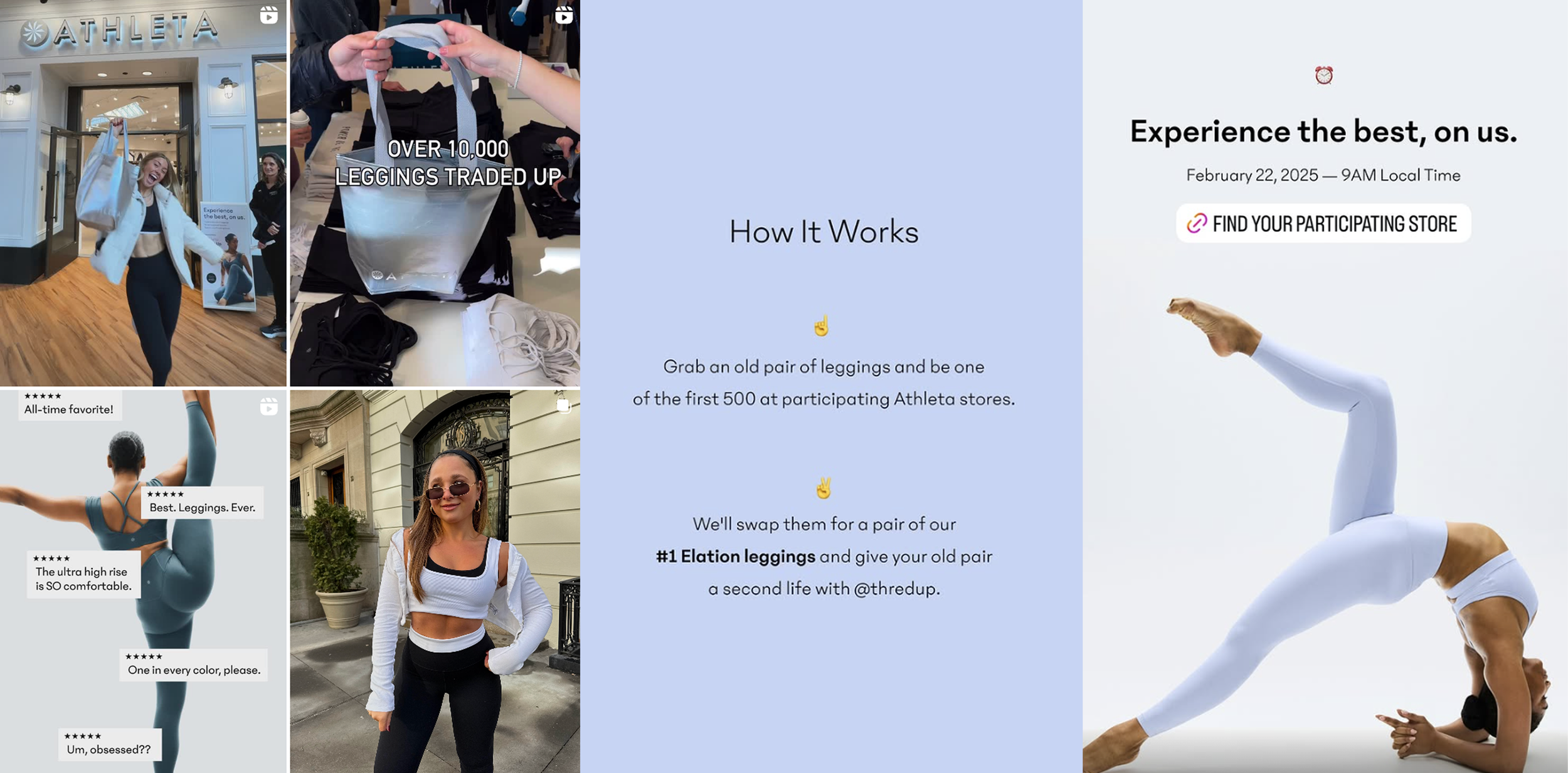 Beyond the physical queues, the event ignited a flurry of activity on social media. Athleta strategically leveraged its own digital channels to build anticipation and keep its community informed. Pre-event, Athleta utilized a mix of Instagram Story posts and in-feed visuals to announce the trade-in, detailing the simple mechanics and highlighting the limited-time nature of the offer.